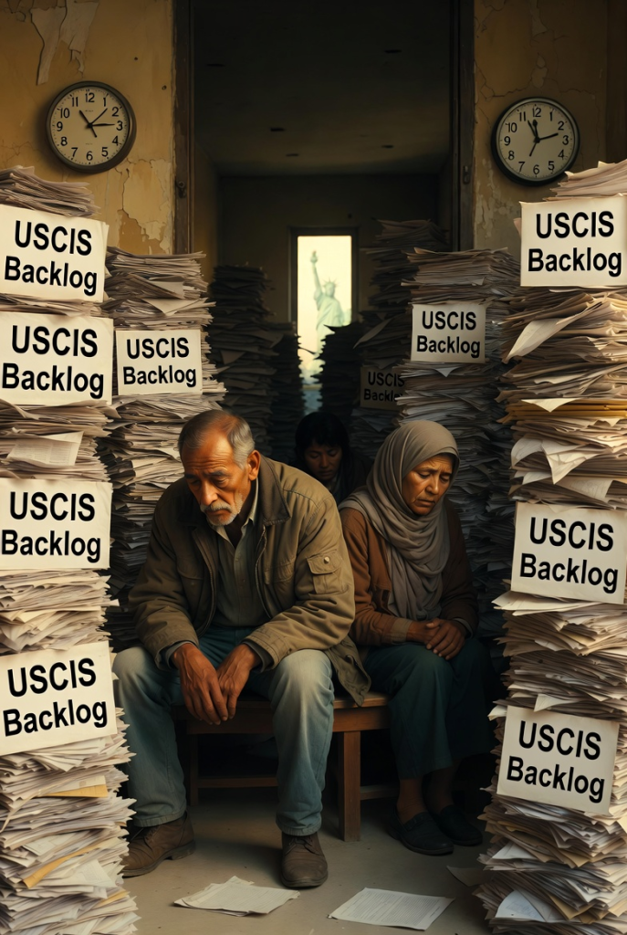 (Image: Visual representation of the overwhelming USCIS immigration backlog with categorized paperwork stacks and waiting applicants. Generated via Grok Imagine.)